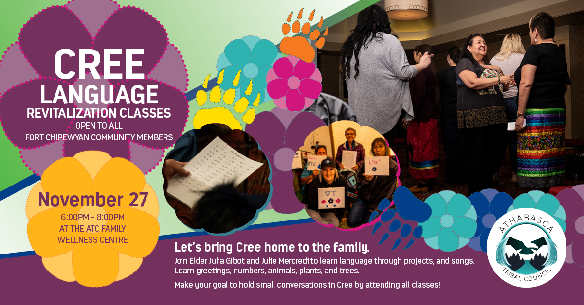 Join Elder Julia Gibot and Julie Mercredi to learn language through projects, and songs. Learn greetings, numbers, animals, plants, and trees. Make your goal to hold small conversations in Cree by attending all classes!