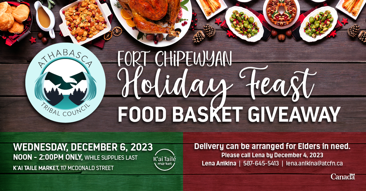 All community members of Fort Chipewyan are invited to pick up a food basket for their household. Items include a Duck, Roast, Stovetop Stuffing, Cranberries, Corn Niblets, bag of Onions, bag of Potato, bag of Carrot, Buns, Butter, Pie and a Christmas Cookie kit.