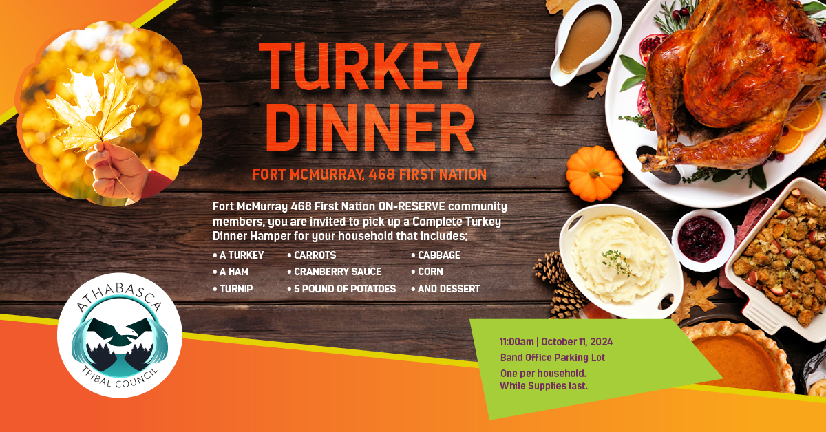 Fort McMurray 468 First Nation ON-RESERVE community members, you are invited to pick up a Complete Turkey Dinner Hamper for your household that includes;
