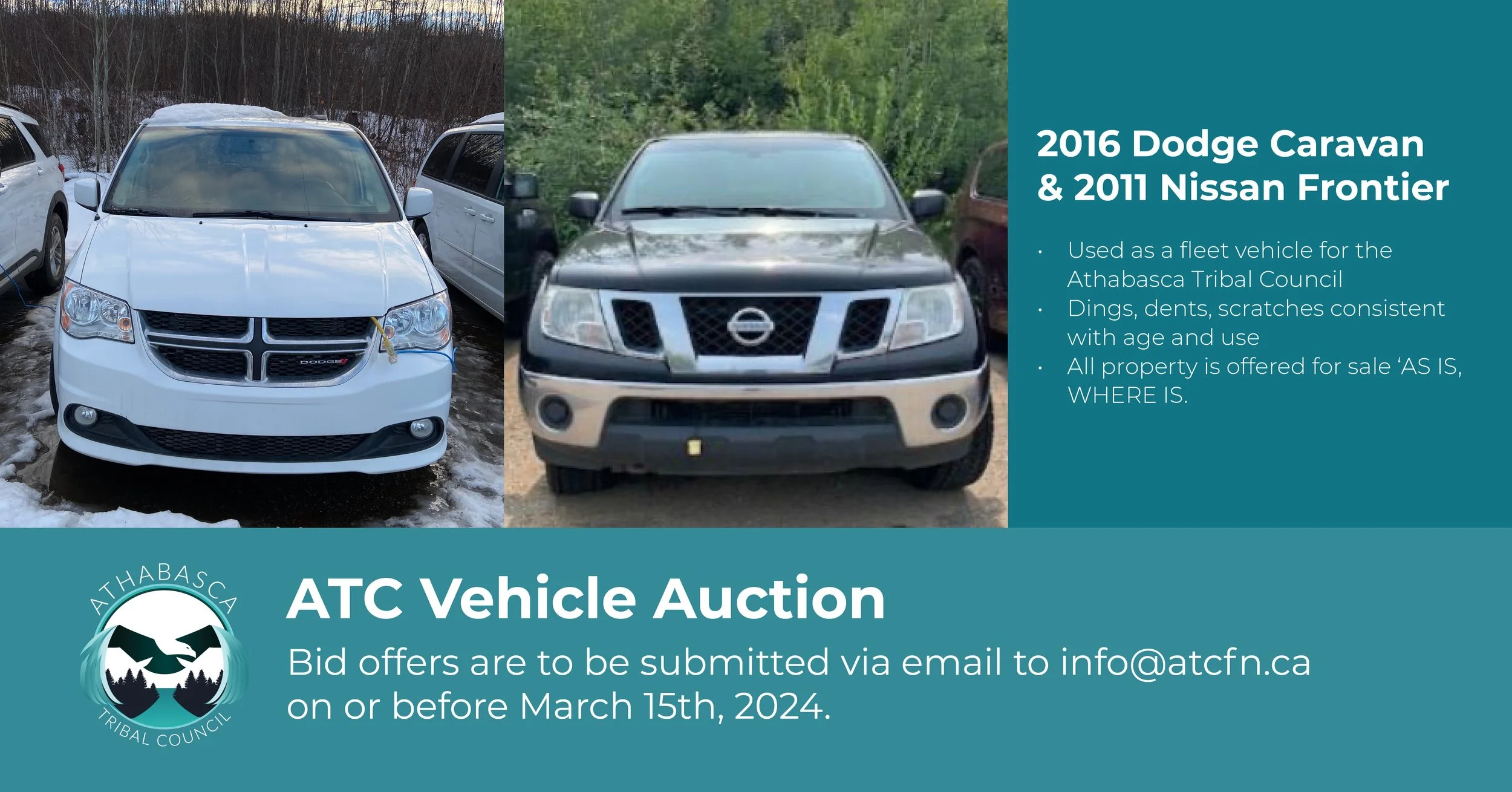 The Athabasca Tribal Council will contact the successful bid application by email. The bid applicant will be given 3 business days to provide payment in full via certified cheque, bank draft, or cash. The vehicle will need to be picked up within 24 hours of completion of payment.